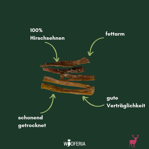 Unsere Hirschsehnen sind ein harter, naturbelassener Kauartikel, der Hunden ermöglicht, ihrem natürlichen Kautrieb ausgiebig nachzugehen. Beim Kauen werden die Zähne sanft gereinigt und die Bildung von Zahnstein kann reduziert werden.